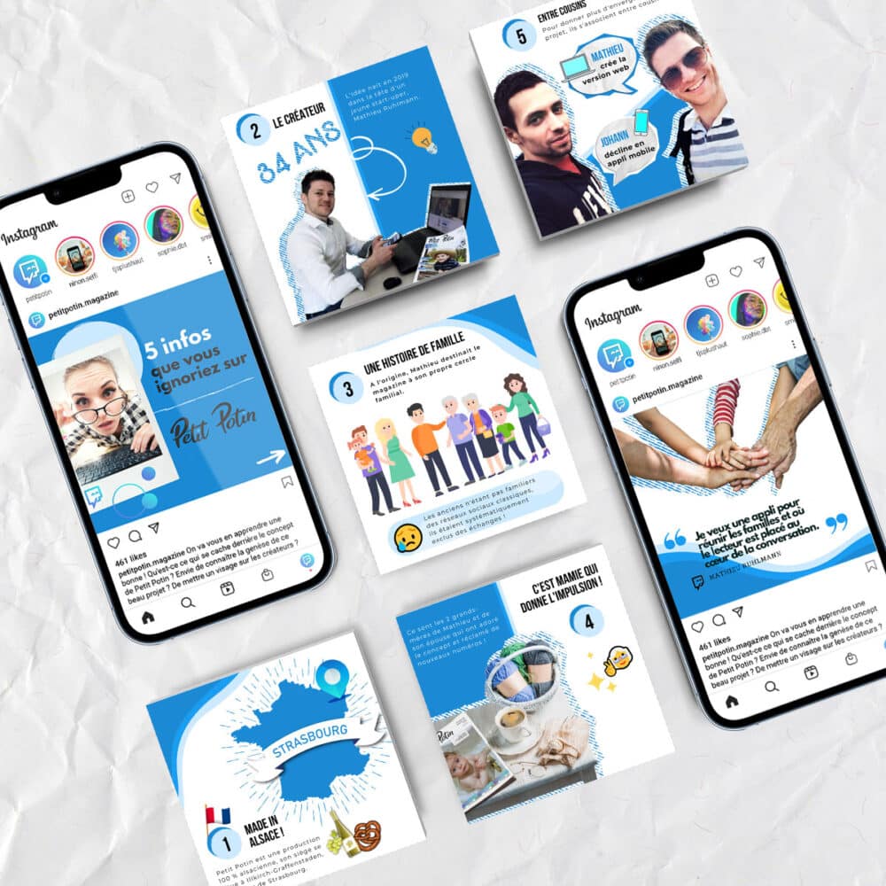 Création des posts Instagram/Facebook et définition du calendrier éditorial. Objectif : informer des nouveautés et dynamiser la communauté.